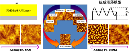 1. 我们设计了PMMA/SAN(即聚甲基丙烯酸甲酯/苯乙烯-丙烯腈无规共聚物)的模型体系,通过微量添加的方式调控薄膜厚度方向的组成梯度,进而实现对薄膜稳定性的有效控制。研究结果发现:纯PMMA和纯SAN薄膜经过长时间的退火均保持稳定,表明上述两种薄膜热力学上浸润氧化硅基底。在GISAXS方法确定共混物在该温度下相容性的基础上,于PMMA中加入微量SAN后,薄膜保持稳定,只是出现了轻微的起伏;而在SAN中加入微量PMMA后,由于PMMA向基底迁移,导致薄膜发生了显著的去润湿。在上述过程中,PMMA与基底(硅片)较强的相互作用扮演了重要角色。一方面,该作用导致PMMA向基底方向迁移,形成了薄膜厚度方向上的组成梯度,这是去润湿发生的必要条件;另一方面,PMMA与基底较强的相互作用抵消了构象熵的损失,造成PMMA中添加少量SAN的薄膜保持稳定。因此,我们的研究工作以较直接的方式验证了该理论的合理性,同时,提供了一种控制薄膜稳定性的新策略:即加入相容性组分,该策略可以有效避免传统添加剂团聚的问题。