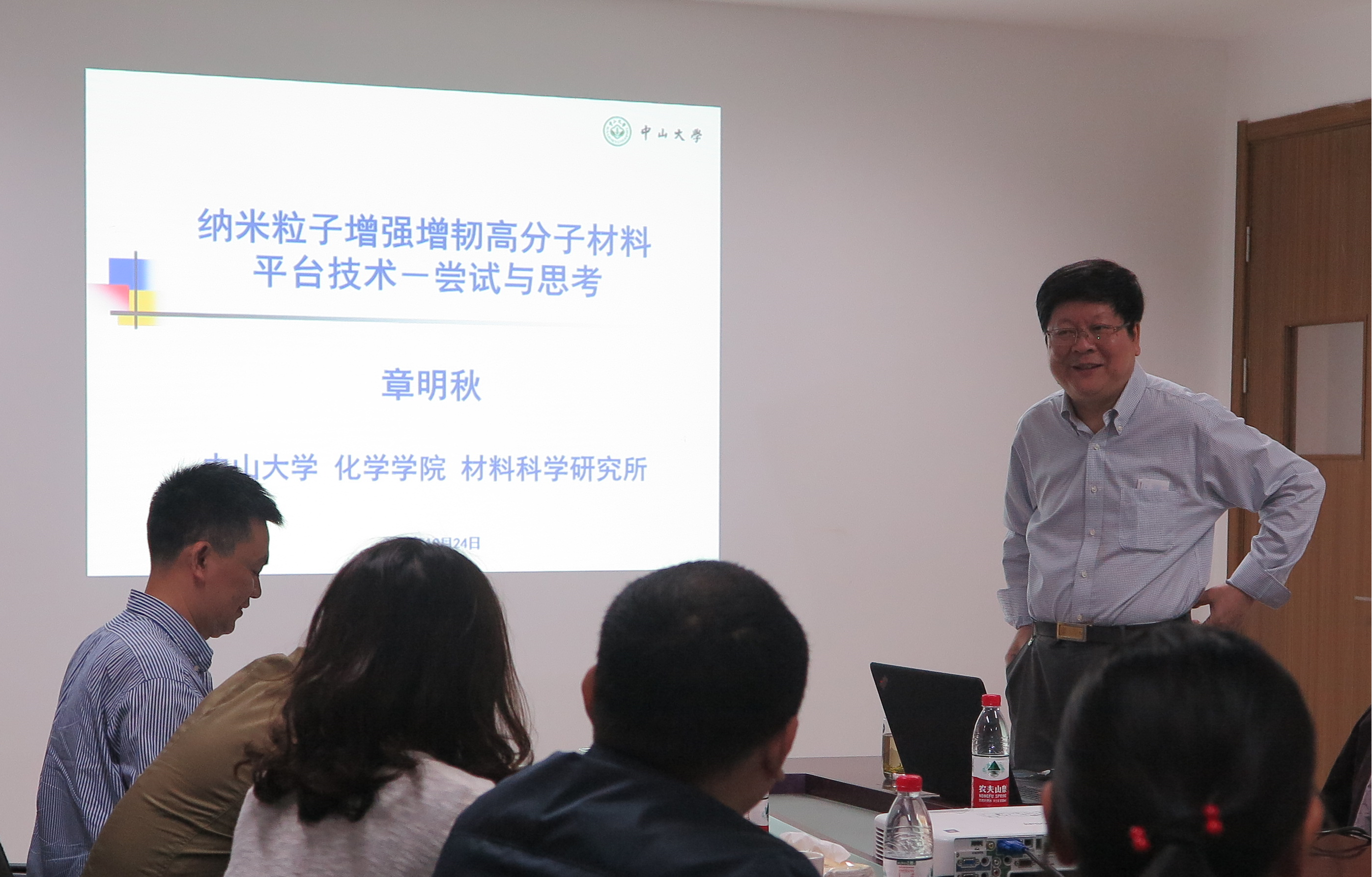 2018年10月25日上午10:00,中山大学章明秋教授应做爱视频 李勇进教授的热情邀请,为材化师生做了题为“纳米粒子增强增韧高分子材料的平台尝试——尝试与思考”的学术报告。