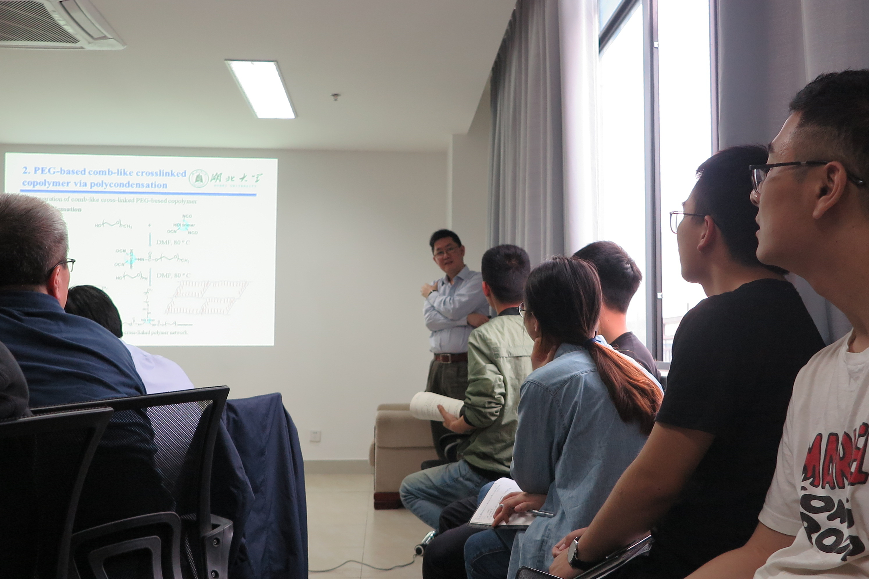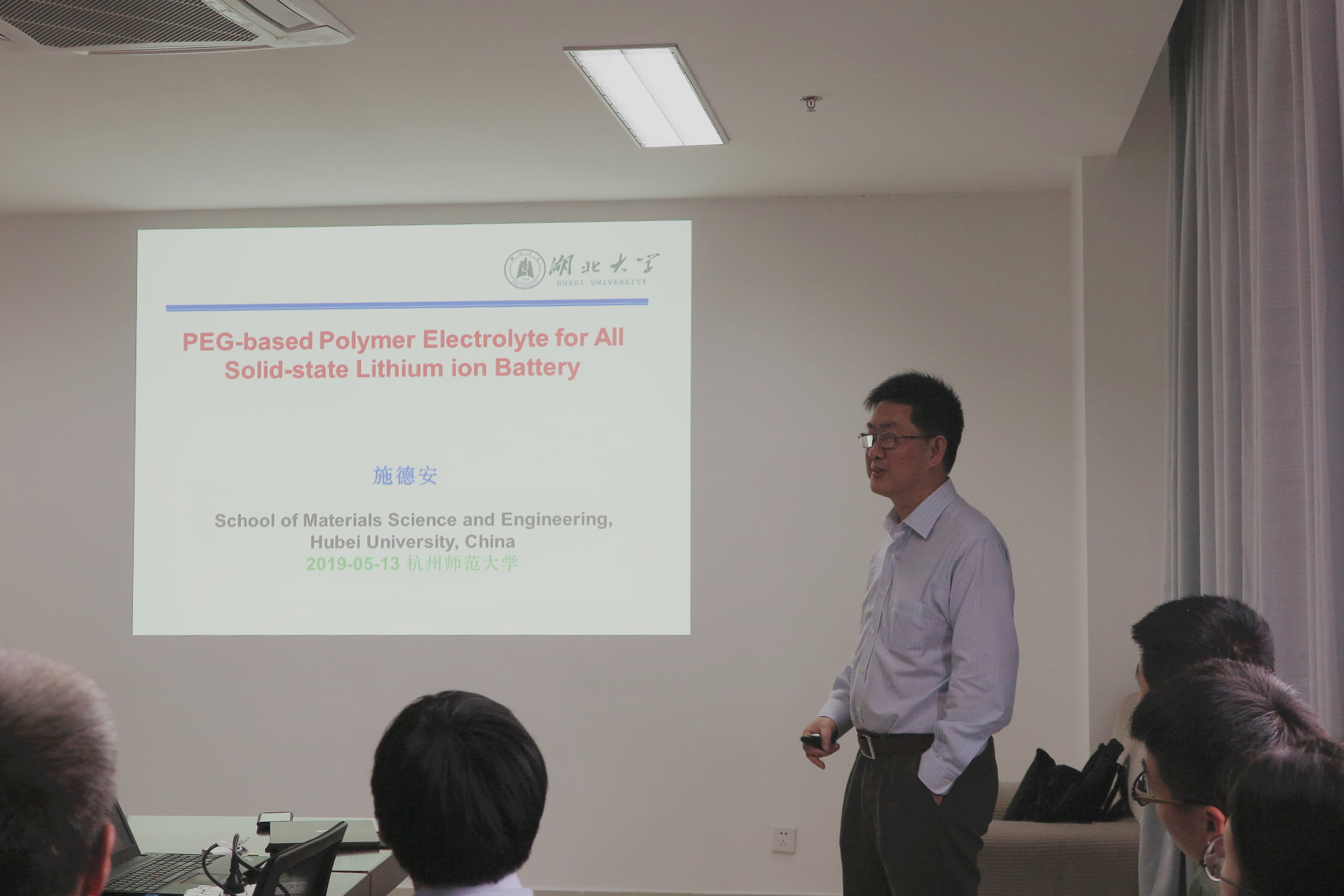 2019年5月13日上午9:00,中科院化学研究所张军研究员与湖北大学施德安教授应做爱视频 李勇进教授的热情邀请,分别为材化师生做了题为“纤维素绿色加工和功能化的新原理和新方法—从基础研究到应用探索”与“PEG基锂离子电池固态聚合物电解质的合成与应用”的学术报告。