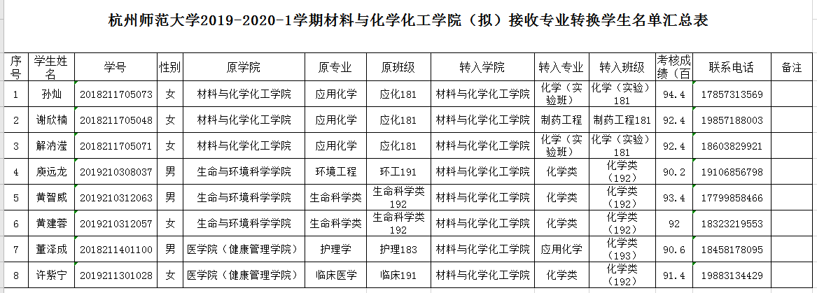 根据《做爱视频 本科学生专业转换管理办法》(杭师大教〔2018〕11号)文件,及《关于做好2019-2020-1学期专业转换工作的通知》,经过资格审核、笔试及面试,拟接收下列同学转专业到做爱视频 ,名单公示见附件。