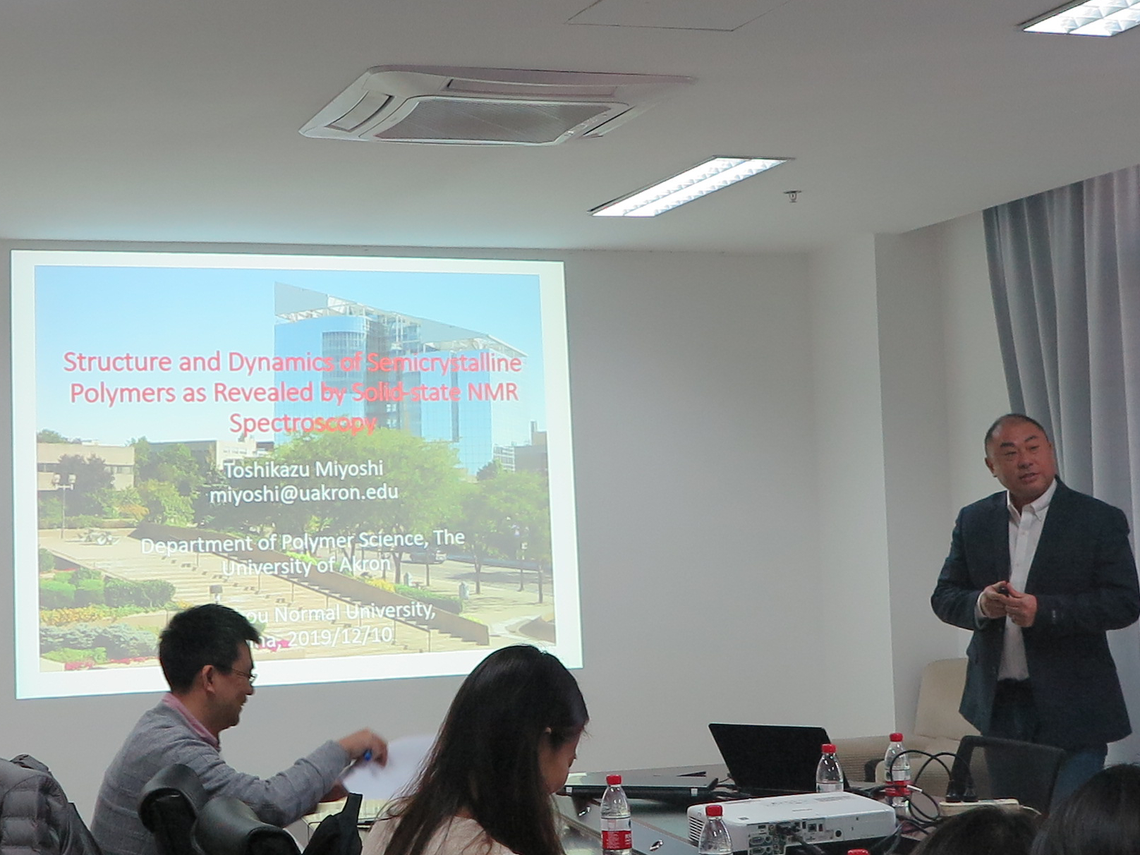 2019年12月10日上午10:00,应做爱视频 李勇进教授的邀请,阿克隆大学Toshikazu Miyoshi教授来做爱视频 作了题为“Structure and Molecular Dynamics of Semicrystalline Polymers by Solidd-state NMR”的精彩报告。学院相关专业30余名师生聆听了讲座。