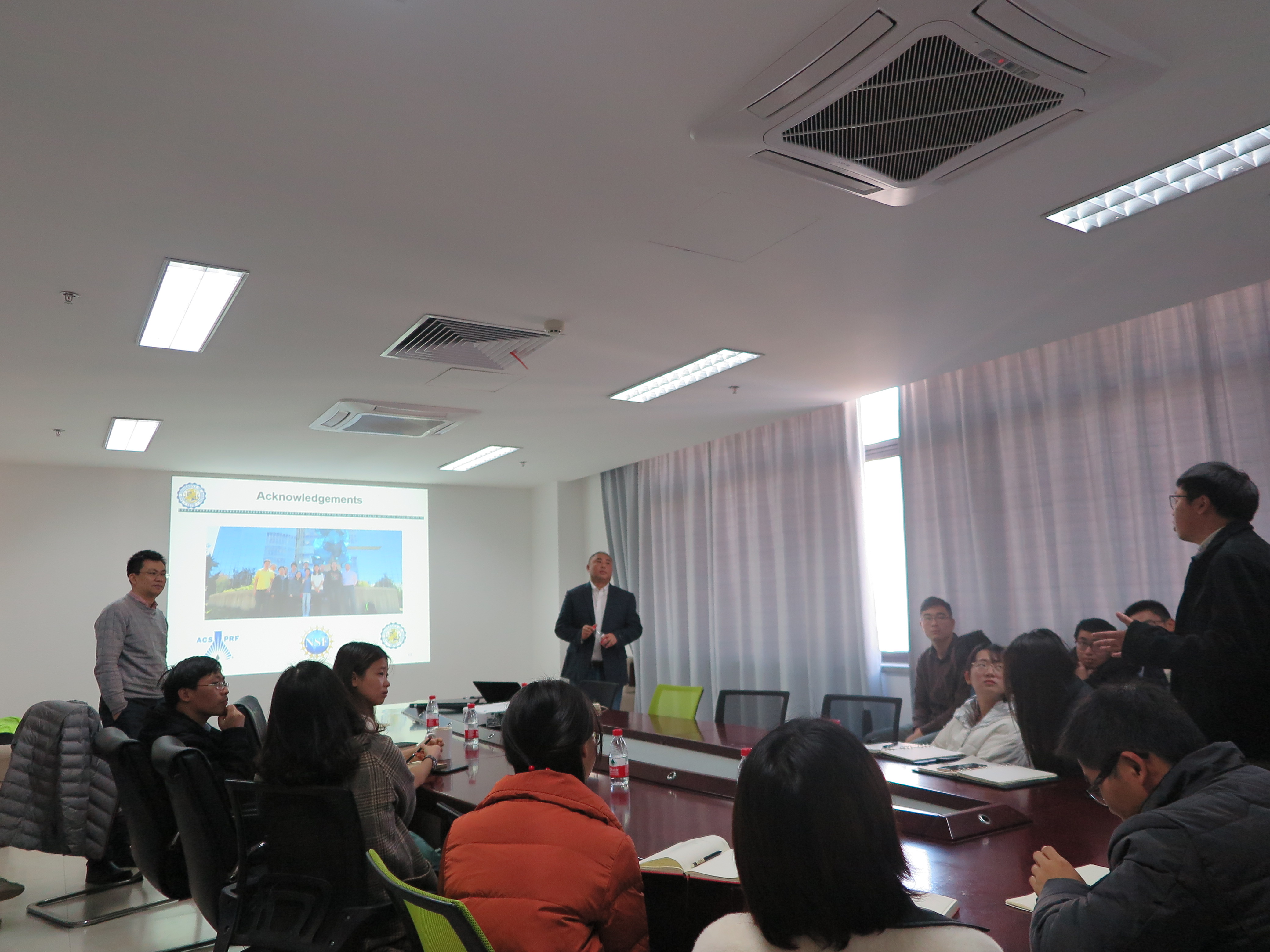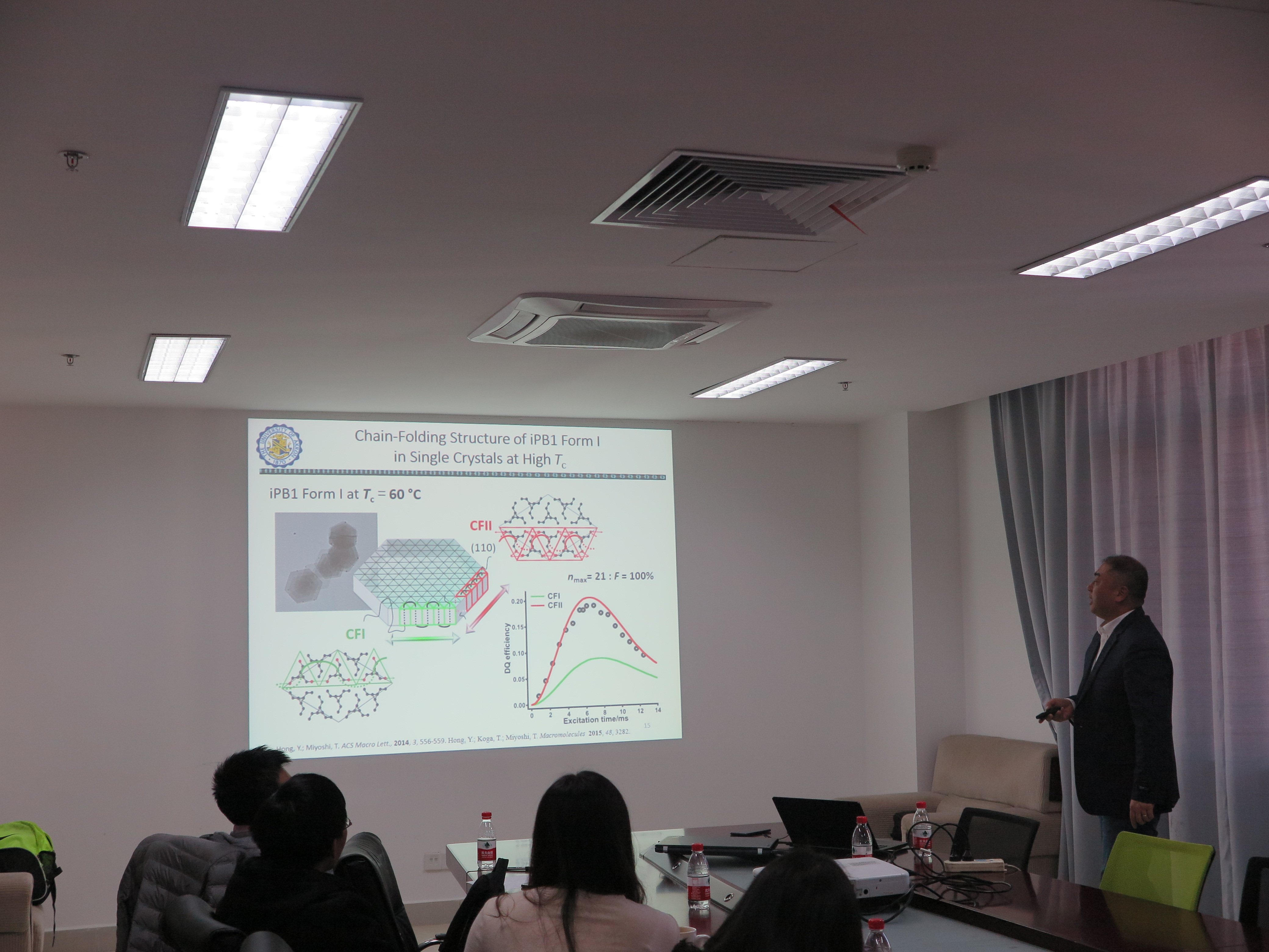 在李勇进教授对Toshikazu Miyoshi教授作了简单介绍后,报告在师生们热烈的掌声中拉开帷幕。固体核磁共振波谱是研究有机分子在分子尺度上的局部结构和动力学的有力工具之一。Toshikazu Miyoshi教授正在研究各种半结晶聚合物的结构和分子动力学。在这次演讲中,主要介绍三个主题,分别是长链聚合物在溶液和熔融晶体中的链折叠结构;聚丙烯腈对碳纤维的化学反应;半晶聚合物的分子动力学。报告的内容充实又新颖,赢得了大家的热烈掌声。且在报告进行中可以随时进行提问和互动,更方便了大家的理解。最后,Toshikazu Miyoshi教授对这次报告的内容进行了精辟的总结,还与老师和同学们探讨了存在的问题及解决方法。