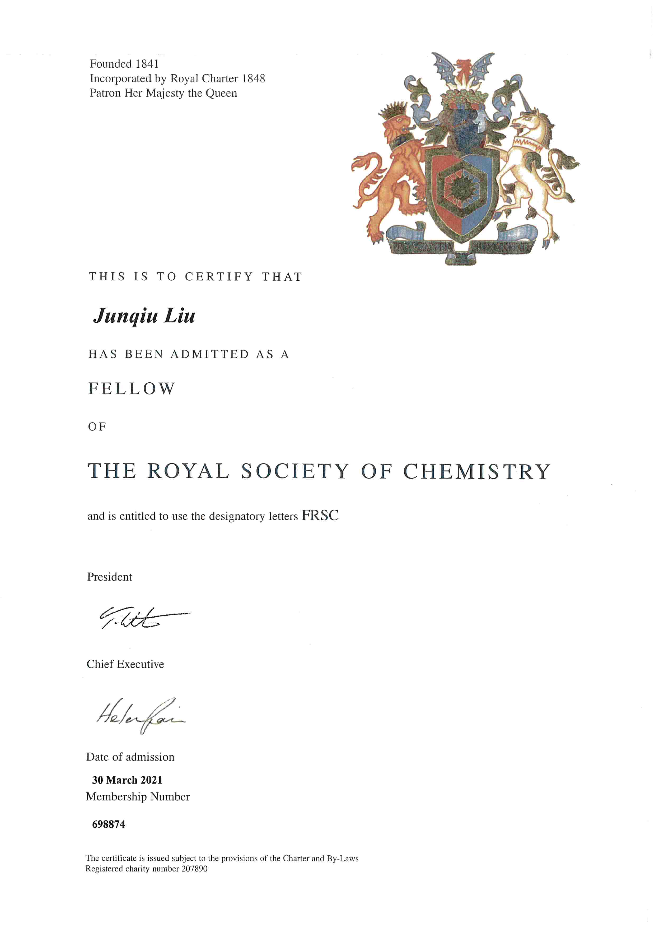 英国皇家化学会(Royal Society of Chemistry)成立于1841年,是世界上历史最悠久的化学学术团体和欧洲最大的化学科学团体,也是国际上最有影响的国际权威学会之一。学会每年从专家推荐的700名以上候选人中遴选出50名左右、英国及国际上在化学科学研究领域取得出色成就和为推动化学科学发展作出卓越贡献的科学家为其会士(Fellow)。此次刘俊秋教授因其在化学科学领域的研究贡献被英国皇家化学学会邀请成为Fellow。