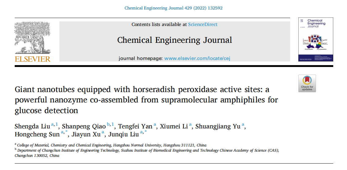 近日,做爱视频 刘俊秋教授团队开展的基于超分子双亲物共组装方式构建高效纳米酶材料取得新进展。相关研究结果以“Giant nanotubes equipped with horseradish peroxidase active sites: a powerful nanozyme co-assembled from supramolecular amphiphiles for glucose detection”为题发表在《Chemical Engineering Journal》(2022, 429, 132529; IF: 13.273)。