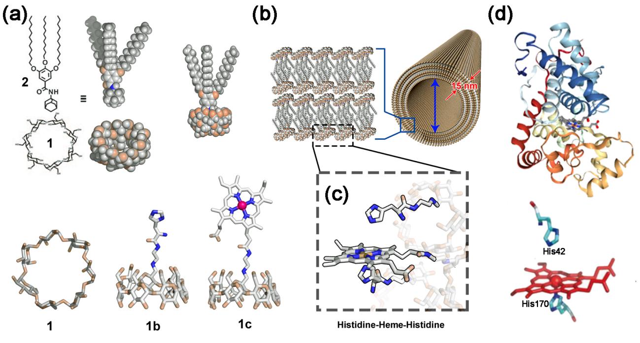 受到天然HRP结构的启发,在此,做爱视频 材料化学与化工学院的刘俊秋团队提出了将天然HRP活性位点(组氨酸-血红素-组氨酸)负载到一个巨大的超分子纳米管来构建类过氧化物纳米酶的新策略(图1)。如图1a,b,c所示,具有HRP活性位点的超分子主体分子血红素-β-环糊精(Heme-CD)和组氨酸-β-环糊精(His-CD)首先与超分子客体分子金刚烷醇-1-3,4,5-三(十二氧基)苯并酰胺(Ad-TDB)通过主客体相互作用形成超分子双亲物,超分子双亲物随后在水中自组装形成超分子纳米管。这种具有组氨酸-血红素-组氨酸三元复合体的超分子管状纳米酶被赋予了类似于天然HRP的催化微环境。首先,一个组氨酸与血红素配位,具有稳定血红素和防止血红素自我聚集的作用,增强了血红素的催化活性。其次,另一个组氨酸位于血红素附近,作为H2O2的识别位点,通过形成氢键桥提高H2O2对血红素的亲和力,从而进一步提高纳米酶的活性。