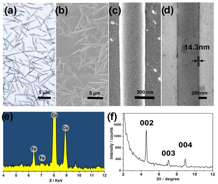 研究结果显示,溶液中超分子组装体的流体水和直径大约为200 nm。光学显微镜、扫描电子显微镜(SEM)及低倍率透射电子显微镜(TEM)表明组装形成的超双亲HRP纳米酶是棒状结构(图2a,b,c)。高倍率TEM表明该聚集体具有管状的中空结构,是超两亲分子组装形成的一种典型的管状结构。其纳米管的内径为 391.9 nm,壁厚约为 14.3 nm(图2d)。纳米管处的能量色散X射线光谱(EDX)表明该纳米管上具有Fe元素,这说明此纳米管是由血红素修饰的环糊精和其他环糊精衍生物共组装形成的(图2e)。XRD 结果显示双分子层的厚度约为3.8 nm。TEM 表明纳米管的壁厚约为 14.3 nm,这说明纳米管壁由大约4层的超双亲分子组成(图2f)。
