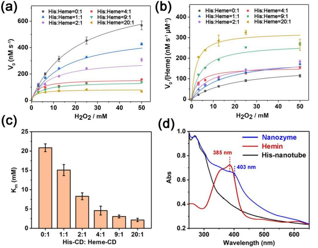 催化分析表明,由His-CD和Heme-CD共同组装形成的纳米酶比由Heme-CD组装形成的纳米酶表现出更高的反应速率,这表明组氨酸有助于提高纳米酶的活性。随后,作者在His-CD/Heme-CD的摩尔比0:1到20:1(定义为Nanozymehis0到Nanozymehis20)时制备了纳米酶。结果显示,当His-CD/Hemin-CD的比例增加时,纳米酶的米氏常数(Km)下降,其中Nanozymehis20的Km可低至2.16 mM,甚至小于天然HRP的Km(3.70 mM)(图3)。此外,Nanozymehis20显示出纳米酶每一个单血红素最高的二阶速率常数(kcat[Heme]/Km)为572.2 s-1 M-1和相对应的一阶速率常数(kcat[Heme])为1.24 s-1。
