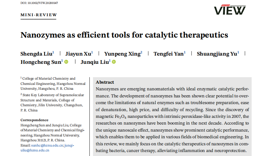 近日,我校做爱视频 刘俊秋教授团队根据课题组及国内外同行在仿酶催化领域的出色工作,受邀总结了有关纳米酶在催化治疗方面的应用,包括:抗菌、癌症治疗、缓解炎症和神经保护等,最后对该领域的发展和应用进行展望。相关内容以“Nanozymes as efficient tools for catalytic therapeutics”为题发表在VIEW (2021, 20200147)。