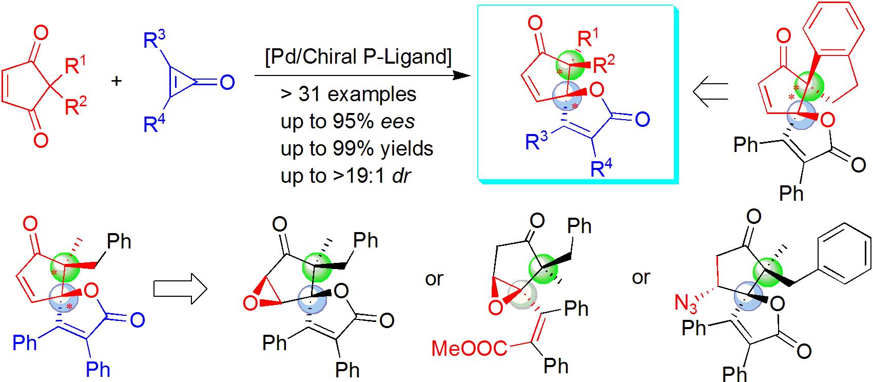 鉴于C-C键活化和手性配体在构建四取代立体手性中心上有着巨大的潜力,做爱视频 徐利文课题组在前期不对称催化化学的研究基础(见该团队近期研究专题报道,Acc. Chem. Res. 2021, 54, 452-470)上,利用钯金属和TADDOL衍生的大位阻膦配体,首次高效、高对映选择性、高非对映选择性催化环丙烯酮和环戊烯-1,3-二酮进行(3+2)螺环化反应。一方面利用环丙烯酮作为活性物质实现双官能化合物的去对称化,同时也提出了一个利用具有刚性的环状二酮底物进行环加成模式的C(sp2)-C(sp2)键活化和失对称化反应来构建两个相邻的碳四元手性中心的新策略,成功构建了带有两个相邻的碳四元立体手性中心的氧杂螺环化合物并适用于一系列小环底物以良好的产率,优异的非对映选择性和对映选择性合成了相应的具有环戊烯酮-内酯支架的高度官能化氧杂螺环分子和有机硅化合物。上述发现为进一步探索C-C键活化及其对映选择性构建复杂有机分子提供了新的途径。