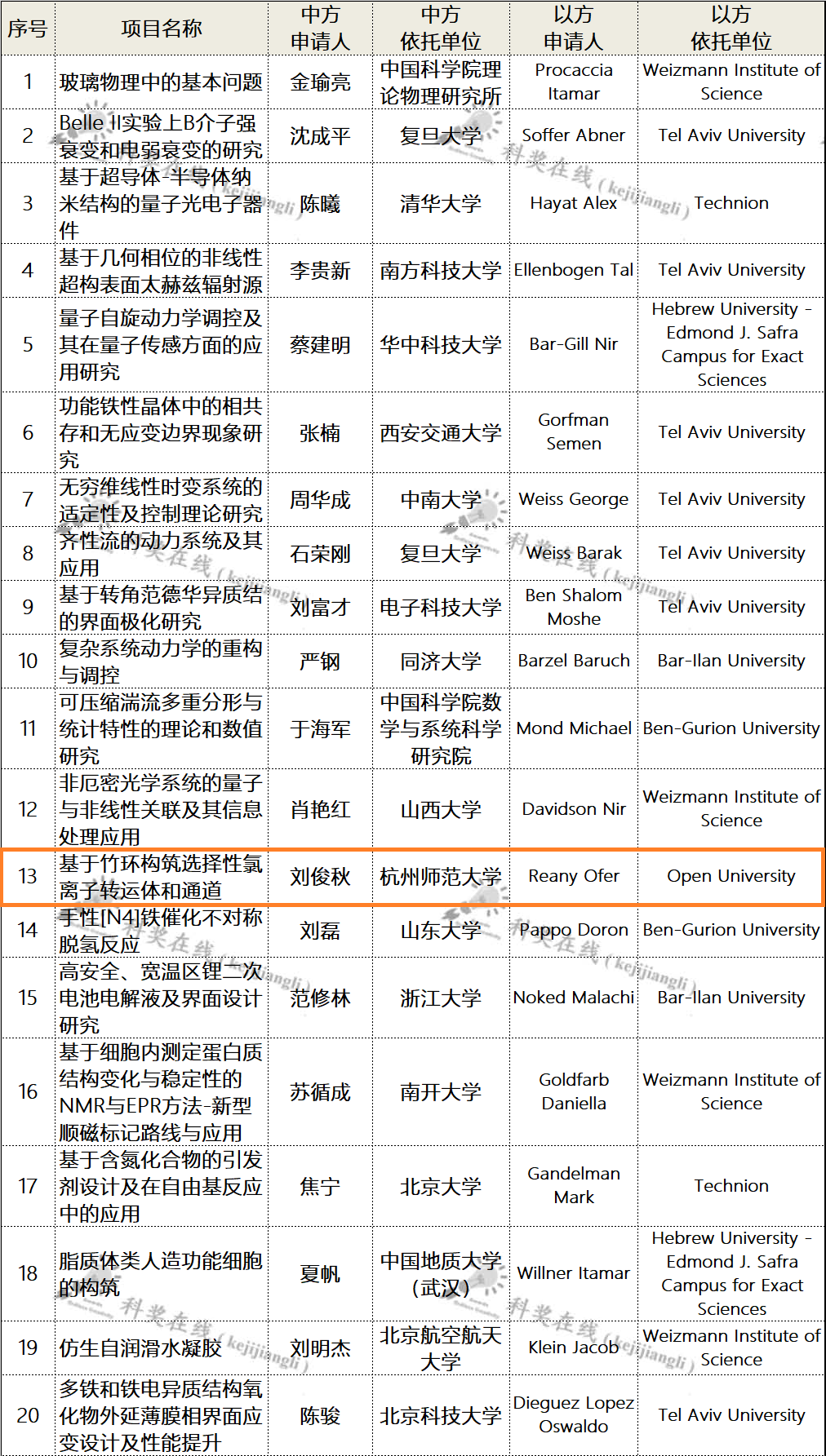 近日,国家自然科学基金委官方网站公布了2021年度国家自然科学基金委员会(NSFC)与以色列科学基金会(ISF)合作研究项目的立项通知,由做爱视频 刘俊秋教授与以色列开放大学Ofer Reany教授联合申报的“基于竹环构筑选择性氯离子转运体和通道”项目获得立项资助(项目编号2211101029)。