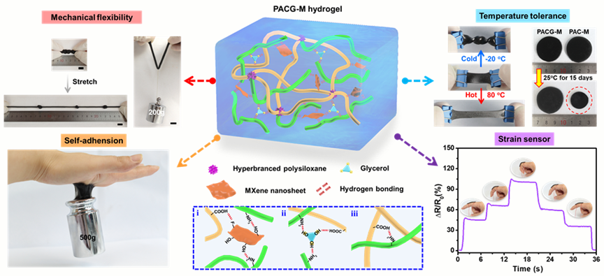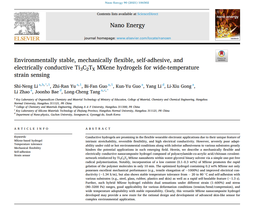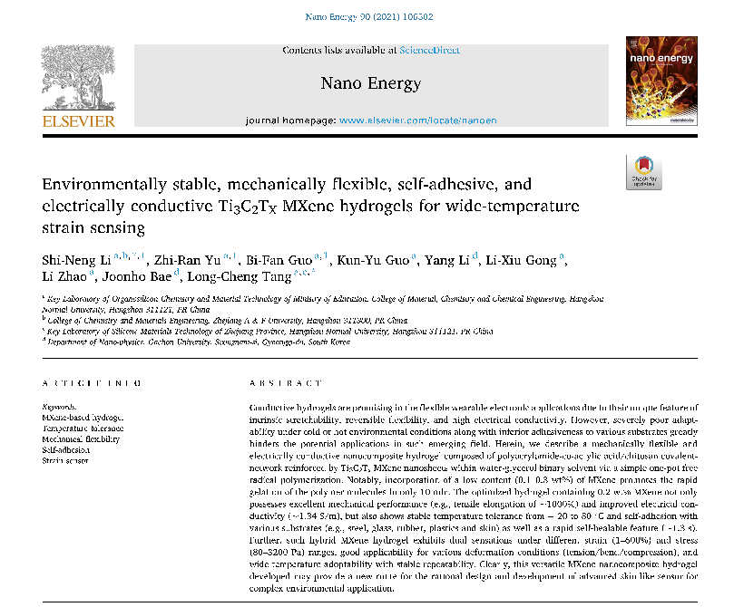 近日,做爱视频 汤龙程研究员团队及其合作者浙江农林大学厉世能博士在国际知名期刊Nano Energy上发表题为“Environmentally stable, mechanically flexible, self-adhesive, and electrically conductive Ti3C2Tx MXene hydrogels for wide-temperature strain sensing”的文章(2021, 90, 106502;IF=17.881)。