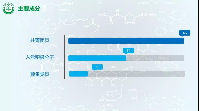 化师191每位同学都是药物的一种成分,其中46名共青团员,19名入党积极分子,3名预备党员。除此以外,还有完善的班级管理者建设,以及积极的思想内核。