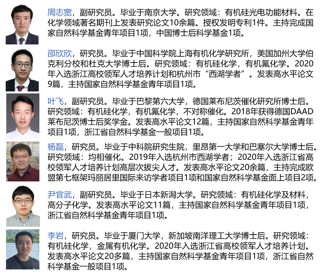 该青年团队自2019年组建以来,在有机氟硅新反应新材料领域开展创新研究工作,取得了一系列重大进展。共获批国家自然科学基金4项,浙江省自然科学基金4项,发表影响因子大于10的高水平论文5篇,3人入选浙江高校领军人才培养计划,2人入选杭州市“西湖学者”。