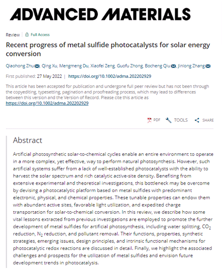 近日,做爱视频 曾晓飞教授、朱乔虹博士团队以“Recent progress of metal sulfide photocatalysts for solar energy conversion”为题在Advanced Materials(IF:30.849)上发表综述论文,系统归纳并描述了如何利用近期研究中的一些重要经验来促进金属硫化物在人工光合作用中的进一步发展。