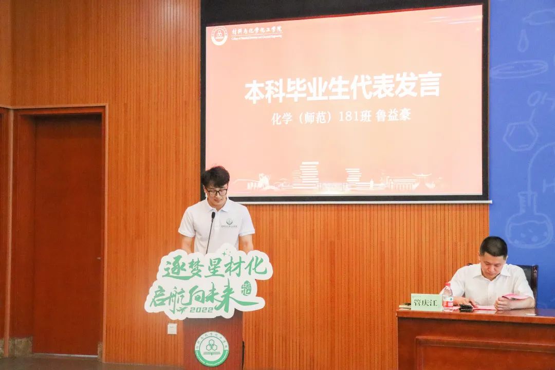 本科毕业生代表化学(师范)181班鲁益豪、研究生毕业生代表有机化学专业的陆佳敏依次发言,表达了对于学院悉心培养的感激之情,回顾了在校期间的生活点滴,描绘了未来人生的美好蓝图。