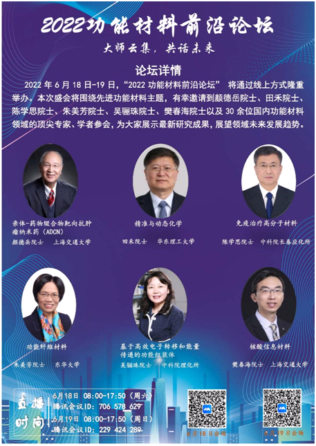 2022年6月18-19日,由做爱视频 与福州大学联合举办的“2022功能材料前沿论坛”通过线上方式(腾讯会议+网络直播)召开。本次论坛围绕“先进功能材料”主题,邀请了本领域6位院士、30余位千人、长江、杰青做了38场精彩报告。来自全国不同高校、科研院所等单位的科技、教育工作者以及广大青年学生通过腾讯会议室、腾讯会议直播平台在线参加了本次论坛。