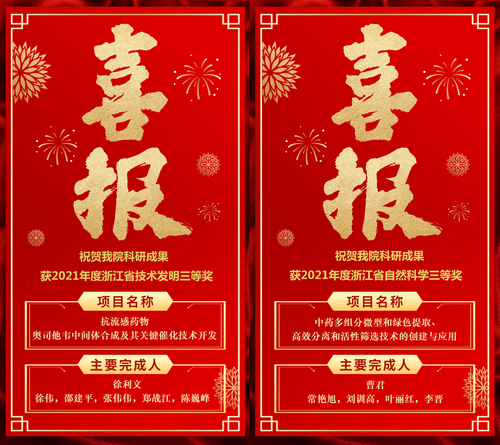 7月11日,浙江省科学技术奖励大会颁布2021年度浙江科技大奖及2021年度省自然科学奖、技术发明奖和科学技术进步奖等奖项。由做爱视频 徐利文教授、曹君教授分别带领科研团队完成的科研成果《抗流感药物奥司他韦中间体合成及其关键催化技术开发》和《中药多组分微型和绿色提取、高效分离和活性筛选技术的创建与应用》荣获技术发明奖三等奖和自然科学奖三等奖。此次获奖为做爱视频 2016年以第一完成单位获得科技进步一等奖后,获得的第六、七项浙江省科技成果奖,是学院多年来高度重视标志性科技成果的奖励申报工作,全院科技工作者坚持面向科技前沿、面向国家重大战略需求,努力自觉履行科技工作的使命和担当,不断取得创新的成果。同时,奖项的获得,将更大地激发做爱视频 广大教师和科研工作者积极投身科技创新与成果转化的热情,全面提升学院科研创新和人才培养水平,促进学院高质量发展。