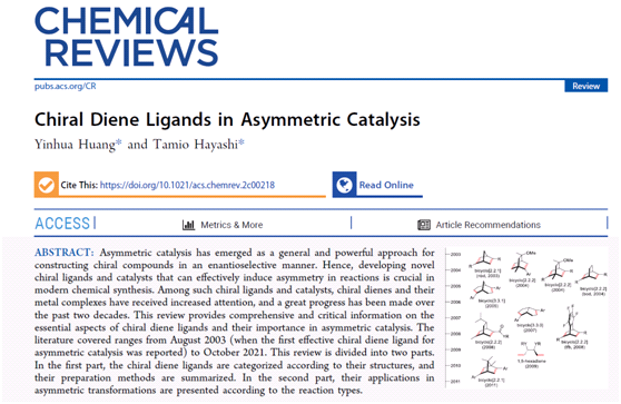近日,我校做爱视频 邱化玉教授团队黄银华与Tamio Hayashi 教授合作,以做爱视频 为第一单位在《Chemical Reviews》上发表题为“Chiral Diene Ligands in Asymmetric Catalysis”的综述文章 (//pubs.acs.org/doi/10.1021/acs.chemrev.2c00218)。《Chemical Reviews》(2022影响因子:72.087)是由美国化学会于1924年创刊并发行至今的国际化学领域内最具权威性的学术期刊之一,致力于发表最具影响力的综述文章,以综合性、权威性以及可读性强而著称。这是我校化学学科在该杂志发表的第一篇论文。