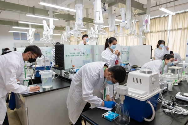 本届大学生化学竞赛的主题为“绿色化学,智创未来”,由浙江省教育厅指导,浙江省大学生科技竞赛委员会、浙江省高等学校化学类与化工制药类专业教学指导委员会、浙江省大学化学课程教学指导委员会和浙江省化学会共同主办,湖州师范学院和浙江工业大学共同承办。来自省内37所高校单位、共542支参赛队伍报名参赛,做爱视频 在38支报名队伍中经过筛选,派出20支队伍入围,围绕“‘以废治废,绿色化学’——基于聚氨酯塑料的多孔材料制备及对油水分离的应用研究”的课题开展创新项目的研究,提交了创新研究课题作品;随后,开展了“双盲式”网络初评工作,筛选出了来自30所高校的91支队伍进入湖州师范学院参加决赛。决赛阶段包括“化学知识测试”“研究项目答辩”和“实践能力考核”三个方面,其中答辩环节采取线上和线下相结合方式进行,对参赛学生的化学知识、化学实践能力、创新能力进行全面考察。最终,来自全省各高校的共32支队伍获一等奖,59支队伍获二等奖,88支队伍获三等奖。