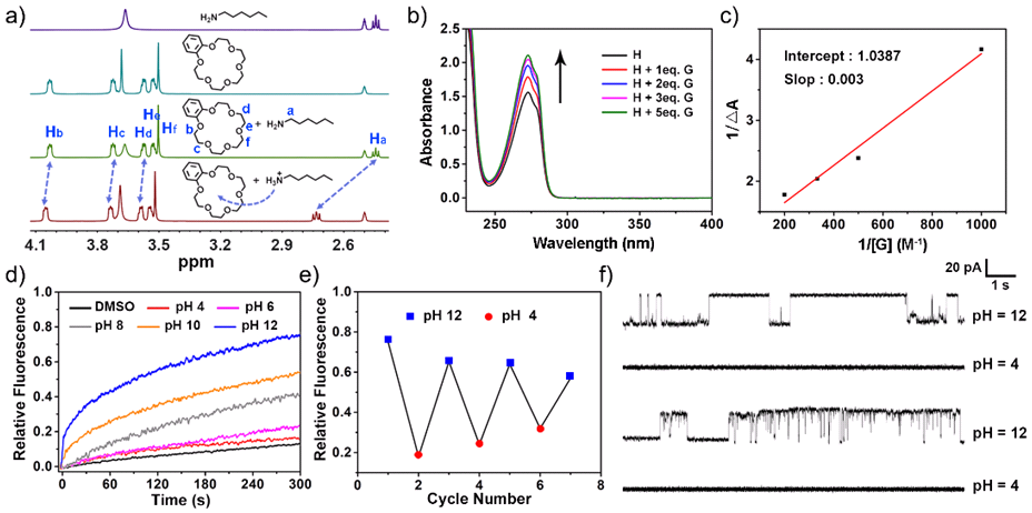 此外,研究人员还通过在聚合物中引入对酸敏感的烷基胺侧链,得到了pH门控型聚合物通道P3(图3)。众所周知,18-冠醚-6与质子化的氨基有较强的结合能力,而与去质子化氨基的结合能力较弱。因此,在酸性条件下(pH = 4),烷基胺基团处于质子化状态,能够与冠醚基团形成主−客体复合物,从而实现对离子通道关闭。在碱性条件下(pH = 12),烷基胺基团发生去质子化并从冠醚基团中解离出来,最终实现了通道的重新开启。通过调节溶液pH的方式,改变18-冠醚-6与−NH2/−NH3+基团之间的复合与解复合,实现了对该柔性聚合物通道开−关的智能调控。