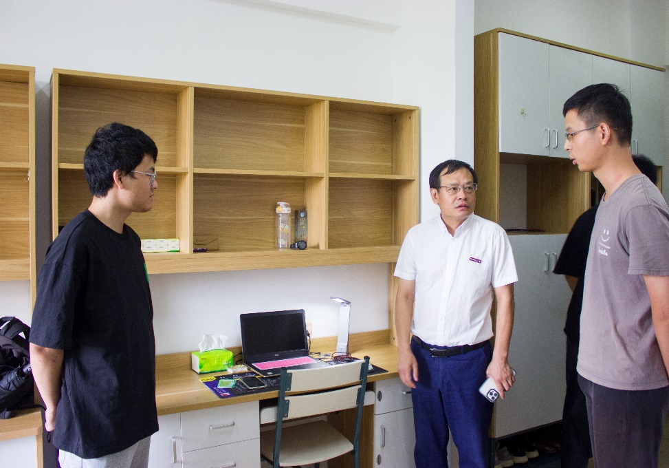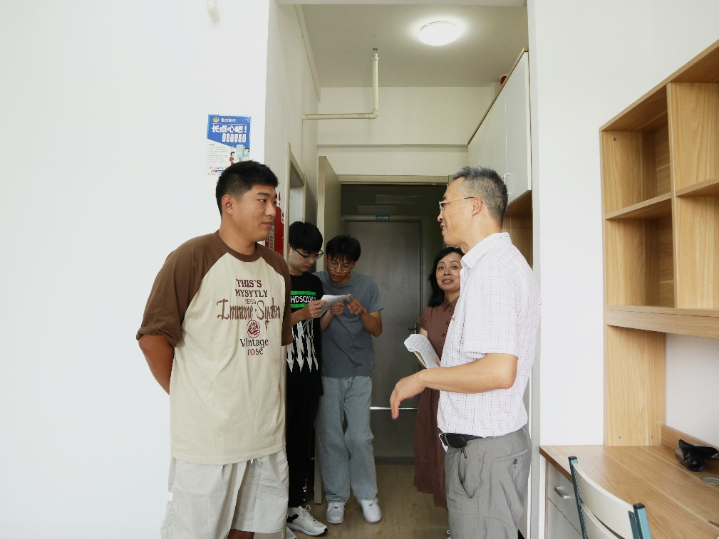 当天,学院领导走访了研究生新生寝室,对各位新同学的到来表示欢迎,叮嘱大家要抓紧适应研究生阶段的科研、学习生活。同时,领导们进一步强调了实验室安全、防诈骗的重要性,结合身边的事例告诫同学们要将“安全无小事”时刻牢记。