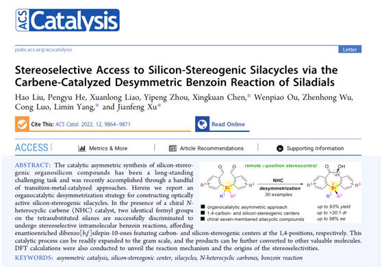 近日,做爱视频 杨丽敏团队在NHC催化合成硅立体中心手性硅环方面取得新的进展,相关研究工作在国际期刊ACS Catalysis(IF: 13.700)发表学术论文“Stereoselective Access to Silicon-StereogenicSilacycles viathe Carbene-Catalyzed Desymmetric Benzoin Reaction of Siladials”.
