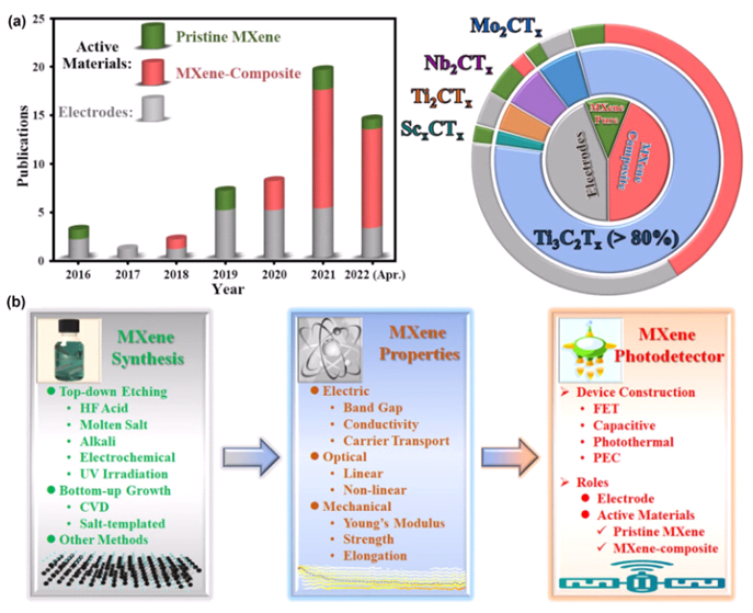随着5G无线网络和物联网的飞速发展,光电探测器的应用引起了人们的强烈兴趣,在成像、检测、传感和监测等不同领域被广泛研究。低维纳米材料有着独特的物理化学性质,在构建各种光电探测器方面有着得天独厚的优势,尤其是近些年呈井喷式发展的MXene(过渡金属碳化物,氮化物和碳氮化物)族群表现出巨大的潜力。调研发现,目前已有近40种MXene材料被成功制备,然而仅有约5种MXene被尝试应用于光电探测器件的制作。