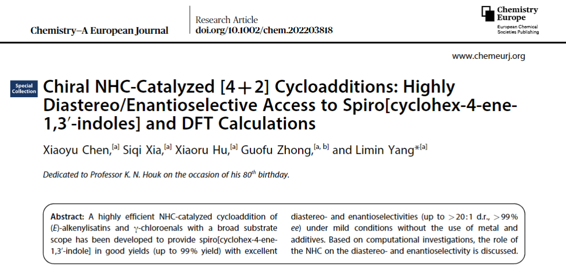 近日,做爱视频 杨丽敏副教授课题组在“Chem. Eur. J.”(IF=5.028)期刊发表学术论文“Chiral NHC-Catalyzed [4+2] Cycloadditions: Highly Diastereo/Enantioselective Access to Spiro[cyclohex-4-ene-1,3’-indoles] and DFT Calculations”.