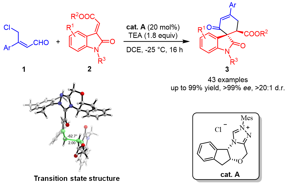 最近,做爱视频 杨丽敏副教授课题组基于课题组先前的研究经验(Org. Lett. 2020, 22, 3329;Org. Lett. 2019, 21, 7943;Chem. Commun., 2018, 54, 1567),与东方理工高等研究院的钟国富教授合作报道了一例手性氮杂环卡宾催化合成手性螺[环己-4-烯-1,3’-吲哚]衍生物的新方法。该催化体系以手性1-氨基-2-茚醇衍生的三氮唑类卡宾为催化剂,以易得的γ-氯代烯醛和靛红衍生的烯酮为底物,顺利合成手性螺[环己-4-烯-1,3’-吲哚]衍生物。反应条件温和,并且无需使用金属和添加剂,官能团耐受性好、收率高、对映选择性好。