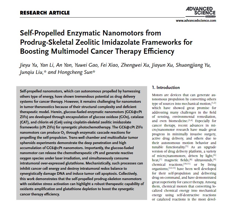 近日,刘俊秋教授团队在酶驱动纳米马达增强肿瘤联合治疗研究方面取得新进展,相关研究工作在国际期刊Advanced Science(IF:17.521)发表学术论文“Self-Propelled Enzymatic Nanomotors from Prodrug-Skeletal Zeolitic Imidazolate Frameworks for Boosting Multimodel Cancer Therapy Efficiency”。