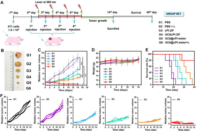 图3 GC6@cPt ZIF纳米马达在小鼠体内的抗癌疗效研究