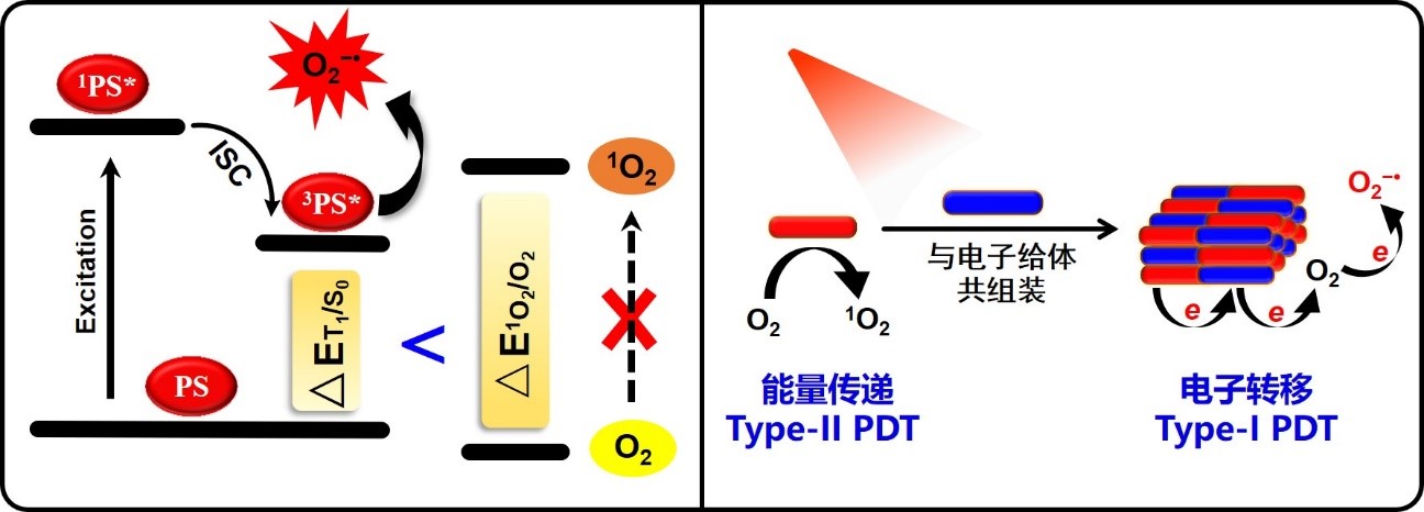 光动力治疗(PDT)是利用光敏药物(光敏剂)在光照下敏化分子氧产生的活性氧对肿瘤或感染性疾病进行治疗的一种治疗方法,由于其具有副作用小、特异性高以及不产生耐药性等优点而备受关注。根据敏化生成活性氧的机制不同,光敏剂可分为I-型和II-型光敏剂。在光照条件下,I型光敏剂和生物底物、分子氧通过多级的电子或质子转移生成活性氧自由基,而II-型光敏剂直接和分子氧通过三线态能量传递生成单线态氧(1O2)。目前已报道的光敏剂大多为II-型光敏剂,其对氧浓度高度依赖,而肿瘤组织固有的乏氧微环境会严重限制PDT疗效。与此不同,I型光敏剂具有良好的乏氧耐受性,即使在乏氧条件下,也可以发挥PDT疗效。然而,由于能量传递和电子转移的竞争,并且光敏剂往往更容易通过能量传递途径敏化分子氧生成1O2,目前缺少有效的策略来控制光敏剂通过电子转移而不通过能量传递敏化分子氧,使得I型光敏剂的设计开发极具挑战。针对上述问题,我们提出了两种构建I型光敏剂的策略,制备了两类基于BODIPY的I型光敏剂:1)通过合理的分子设计降低光敏剂的三线态的能量,使其不能与分子氧发生能量传递生成1O2,从而选择性通过I-型光动力途径生成超氧阴离子自由基 [1];2)通过分子组装的方式引入电子给体或受体,促进光敏剂的电子转移效率,实现了II-型光敏剂到I-型光敏剂的转变[2-4]。