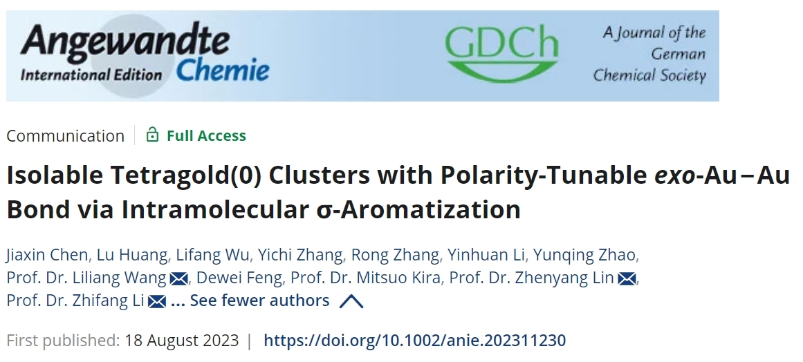 近日,做爱视频 王立亮副教授/李志芳教授团队与香港科技大学林振阳教授团队合作在国际知名学术期刊Angew Chem《德国应用化学》上在线发表了题为“Isolable Tetragold(0) Clusters with Polarity-Tunable exo-Au‒Au Bond via Intramolecular σ-Aromatization”,即《零价四元金簇的合成以及其分子内σ芳构化调控环外金-金键极化行为的研究》研究论文。