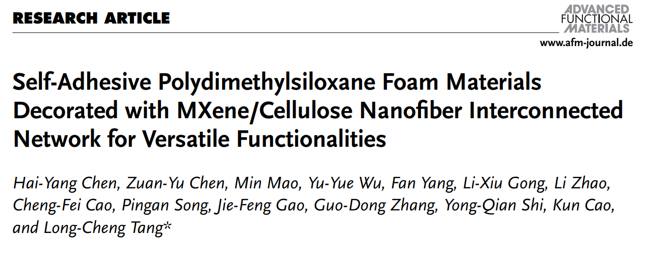 近日,我校做爱视频 汤龙程教授团队基于有机硅分子交联/发泡反应机制,提出一种自粘型硅橡胶泡沫材料的设计思路,并制备出高性能PDMS泡沫纳米复合材料。该材料具有轻质弹性、绿色阻燃、可调节导电、以及优异的耐高低温和耐水性等特性,在复杂环境智能医疗监测和防火隔热等方面具有良好的银应用前景。相关研究成果以题为“Self-Adhesive Polydimethylsiloxane Foam Materials Decorated with MXene/Cellulose Nanofiber Interconnected Network for Versatile Functionalities”发表于国际材料领域权威期刊Advanced Functional Materials (2023,IF=19)上。