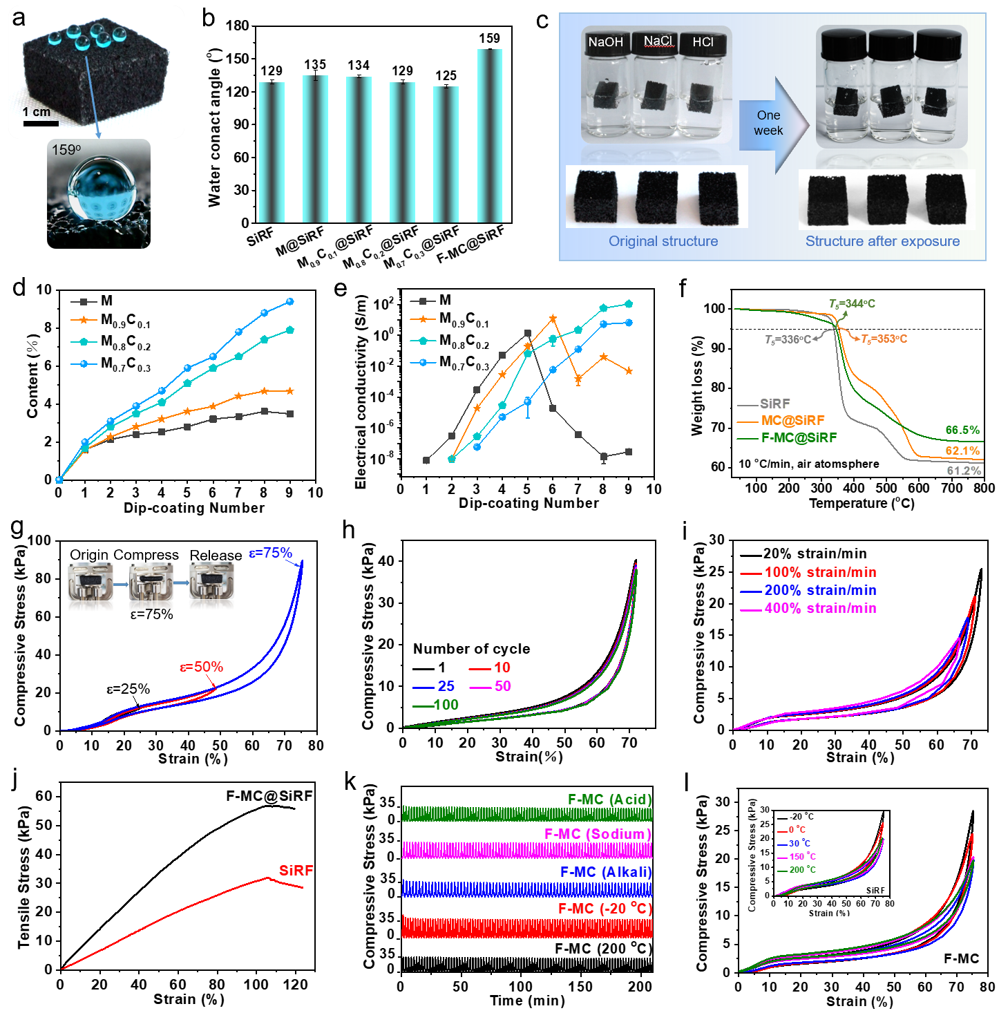 研究人员对上述材料进行综合性能测试,发现其具有优异的表面超疏水性(WCA≈159°)、可调的电导率(从10-8到10 S/m)、增强的热稳定性、在宽温度范围(从-20 ℃到200 ℃)和复杂环境(酸、碱和盐溶液中)下稳定的压缩循环可靠性。
