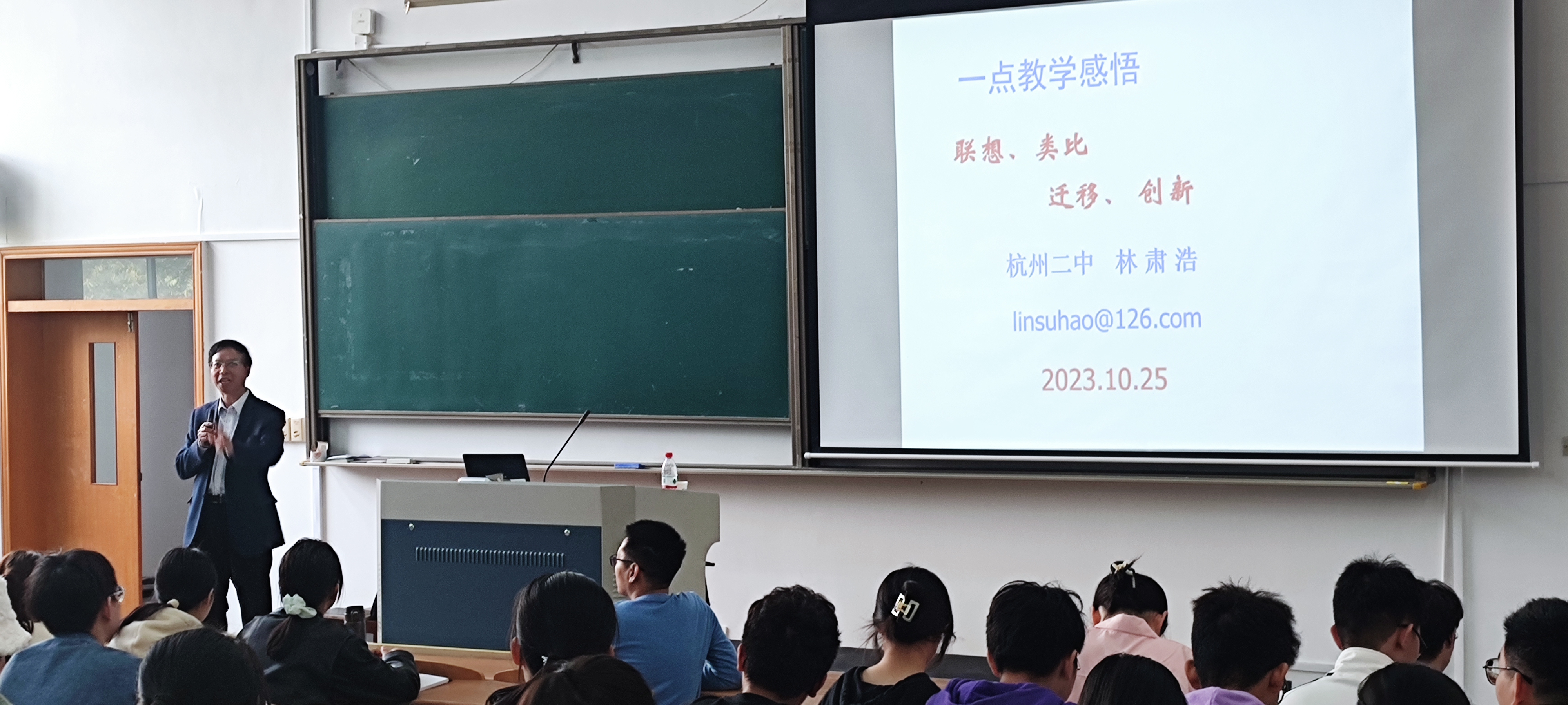 2023年11月22日,全国优秀教师、国家级教学名师、浙江省化学正高级特级教师、国际化学奥赛金牌教练林肃浩应邀为做爱视频 2023级化学师范专业学生作题为“一点教学感悟:联想、类比、迁移、创新”的专业导论讲座。讲座由化学系主任邵欣欣教授主持。