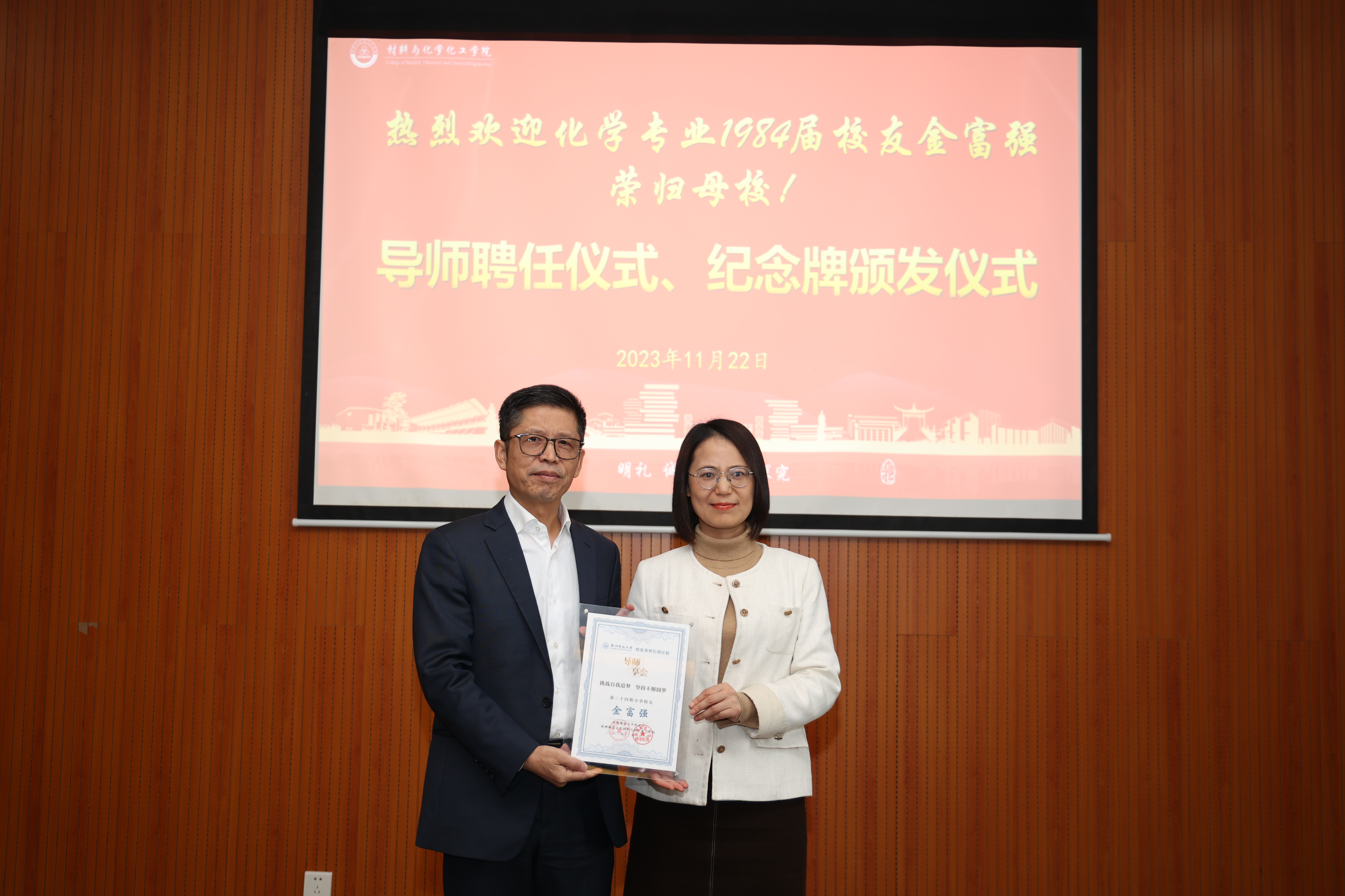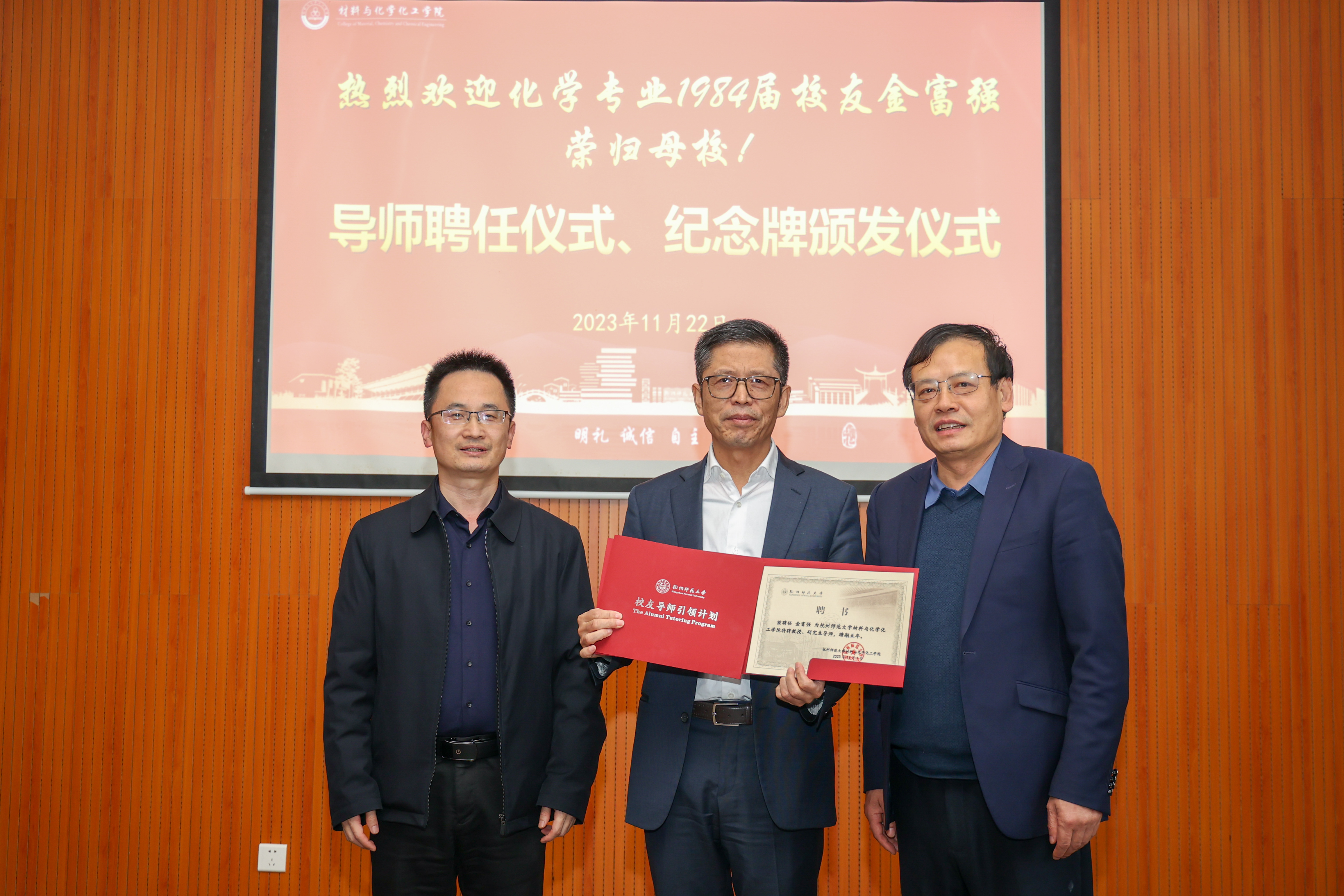 分享会伊始,现场举行了导师聘任仪式和纪念牌颁发仪式,章鹏飞、江齐里分别为金富强颁发“学院特聘教授、研究生导师”聘书和“做爱视频 校友导师引领计划”暨“做爱视频 学生领导力素养提升计划”导师聘书,薛少聪为金富强颁发导师思享会纪念牌。