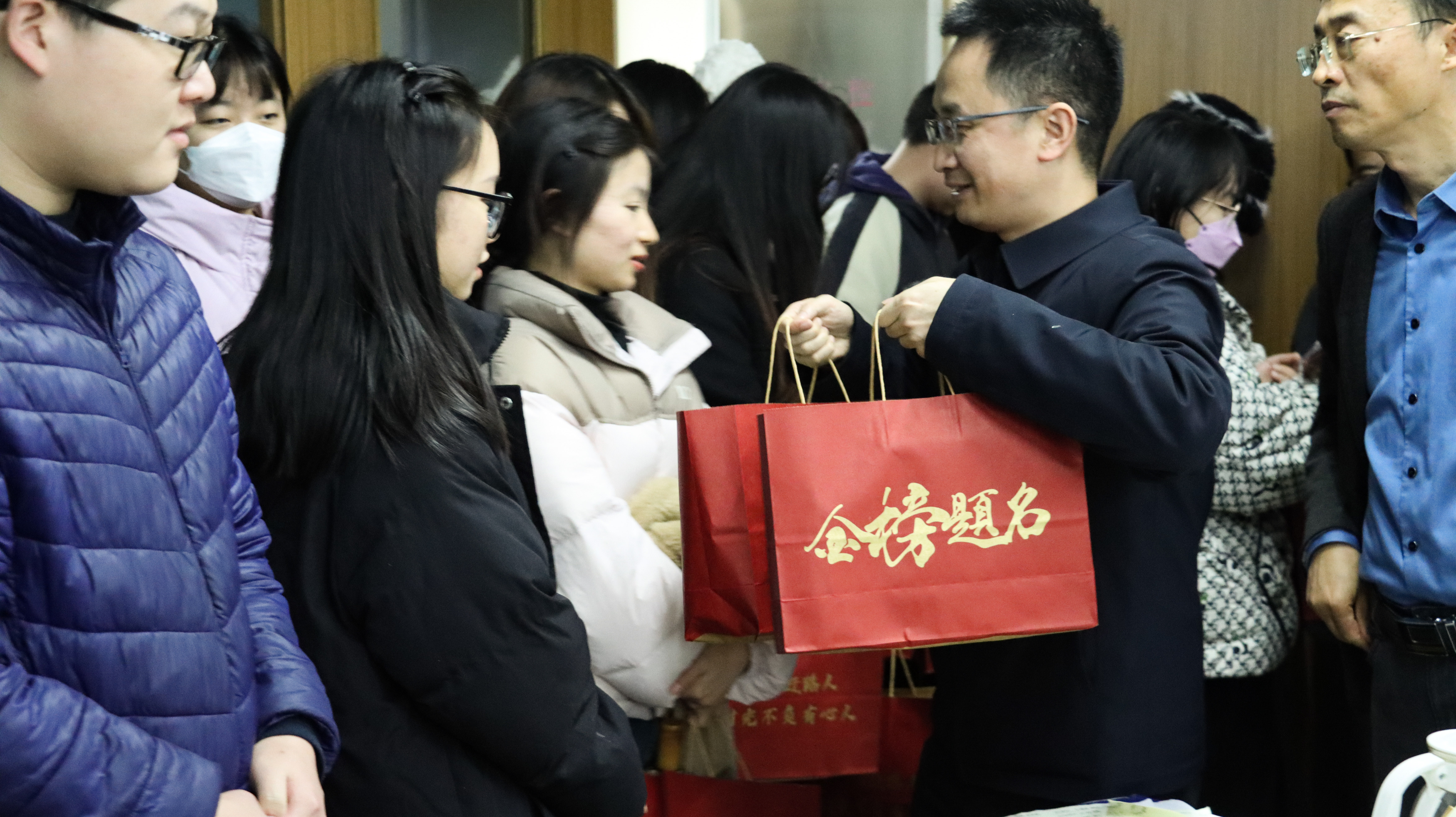 慰问现场,各位老师还与同学们交谈备考体会,传授考试经验,送上“金榜题名”暖心礼包。礼包中的每一个物品都经过了认真筛选与精心设计,不仅有寓意满满的“‘研’气十足”文具袋和“旺气满满”旺仔牛奶,还印有师长们的亲切寄语“星光不问赶路人,时光不负有心人”。小小的物品饱含了学院对考研学子们浓浓关爱和真切祝福,希望考研学子平安如意,发挥出最佳水平!