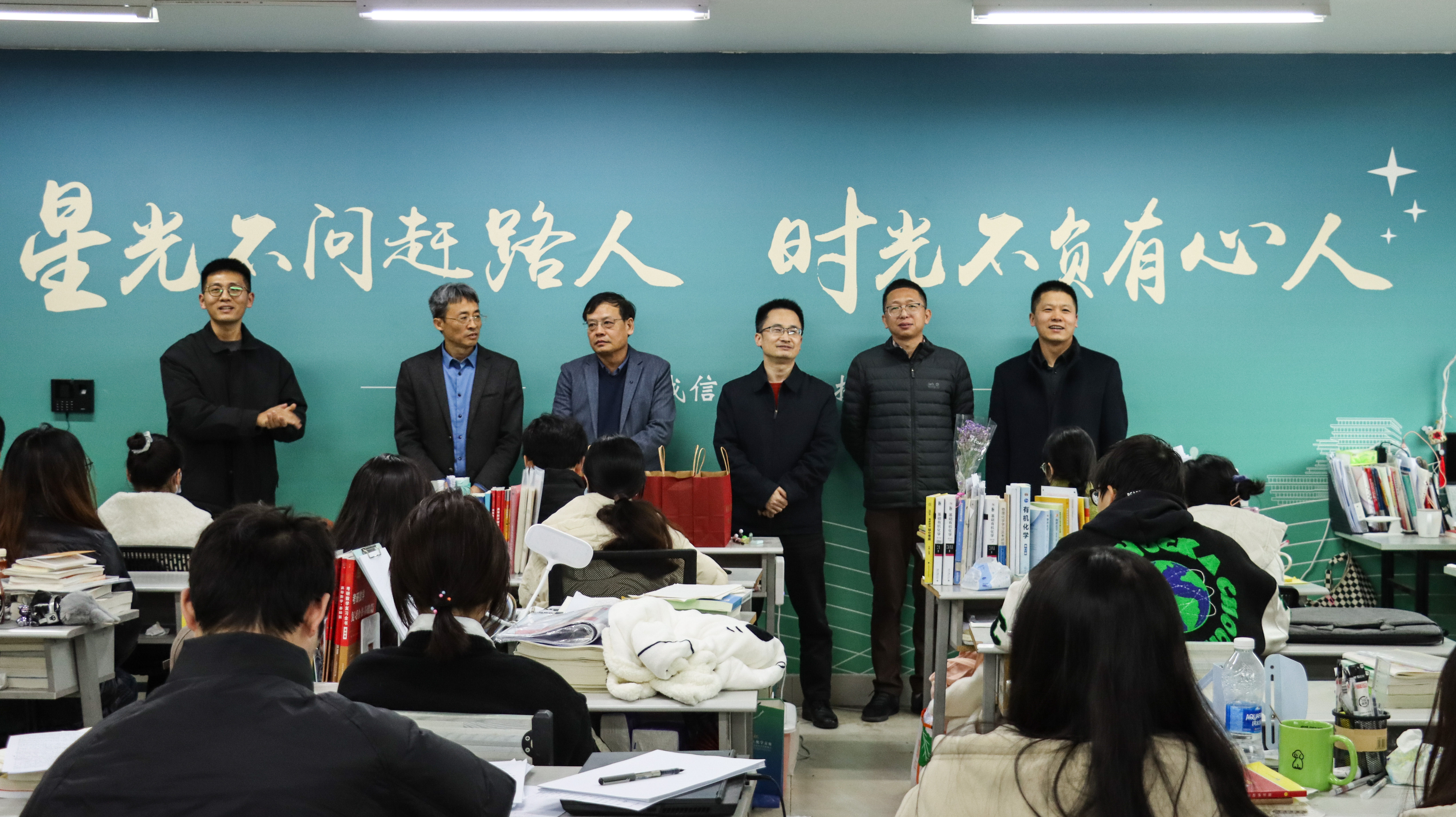 在仓前慰问现场,学院院长章鹏飞、党委书记江齐里、副院长李志芳、副院长王民、党委副书记兼纪委书记管庆江、学工办主任韩秉峻一行走进考研自习室,为即将踏上考试战场的学子送去暖心礼包和殷切祝福。活动由韩秉峻主持。
