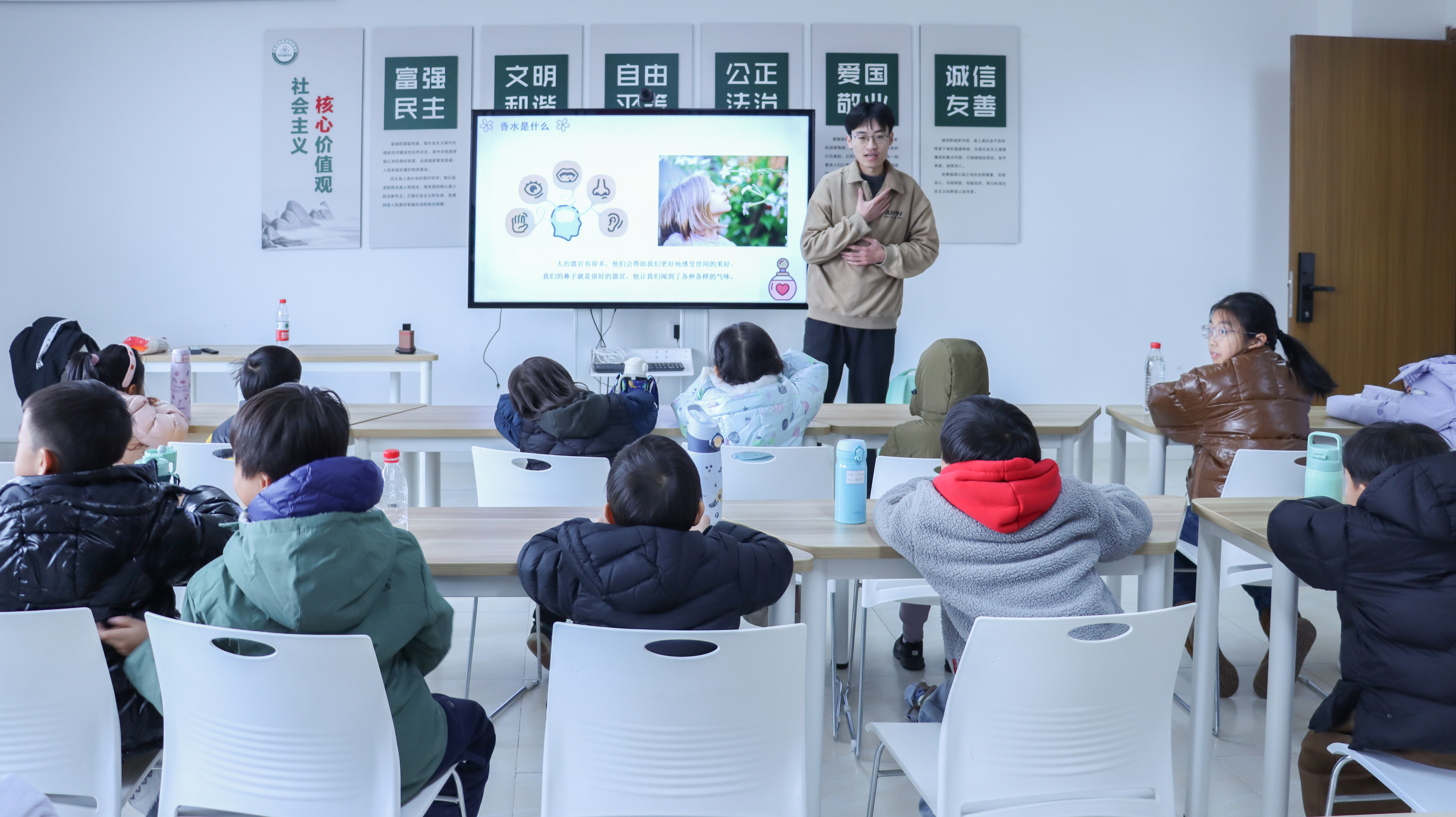 接着,在志愿者陪同下,黄锴奇带领小朋友们前往勤园18-302实验室进行下一步的活动。黄锴奇现场为小朋友们展示了如何制备橘子香水,并且与志愿者完成了实验的整个流程。小朋友们现场尝试,在志愿者的帮助下,制作出了属于自己的橘子香水。