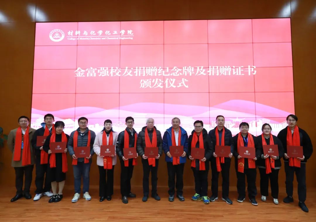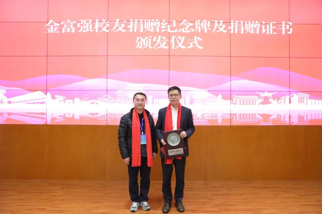 为感谢金富强校友对母校建设和发展的支持和贡献,会议现场,朱炜为其颁发捐赠纪念牌和捐赠证书。