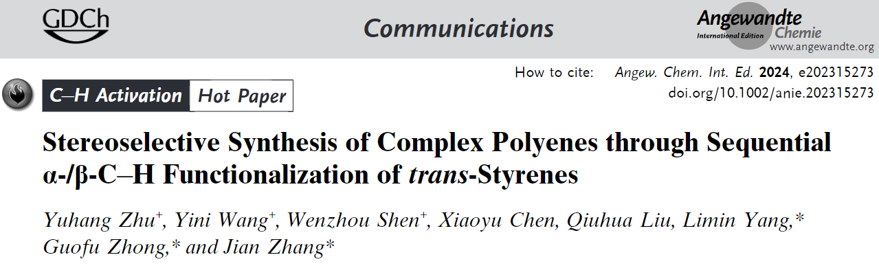 近日,我校做爱视频 张坚教授课题组与钟国富教授、杨丽敏教授展开合作,报导了一种吡嗪酰胺导向下的E-芳基烯烃的α-/β-碳氢官能团化反应,相关研究成果以题为“Stereoselective Synthesis of Complex Polyenes through Sequential α-/β-C−H Functionalization of trans-Styrenes”发表于国际知名期刊Angewandte Chemie International Edition(IF = 16.6)上。