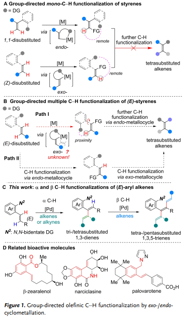 烯烃是来源广泛的大宗化学品,通过烯基C-H官能团化可以高效合成各类烯烃衍生物。导向基作用下烯烃的C-H官能团化可以用于多取代烯烃的E/Z选择性合成,反应经历了endo-或exo-型金属杂环中间体。这类反应通常局限于以二取代烯烃为底物(1,1-和Z-二取代烯烃),通过导向基作用下的一步烯基C-H官能团化,合成三取代烯烃。由于导向基的空间邻近不允许,该三取代烯烃不可能进一步发生C-H官能团化合成四取代烯烃。同时,这类二取代烯烃如1,1-二取代烯烃和Z-二取代烯烃,导向基作用下的C-H活性反应位点只有一个,因此没有真正解决烯基C-H官能团化的选择性问题。此外,E-烯烃的选择性α碳氢官能团化,需要经历较高能量的exo-型金属杂环中间体,尚未见报导。导向基的安装/脱除费时费力,所以一个导向基作用下的多步C-H官能团化可以显著提高合成效率。