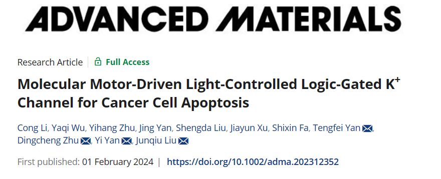 近日,做爱视频 刘俊秋教授团队在光控逻辑门离子通道领域取得新进展,相关研究成果以题为“Molecular Motor-Driven Light-Controlled Logic-Gated K+ Channel for Cancer Cell Apoptosis”发表于国际知名期刊Advanced Materials(IF=29.4)上。