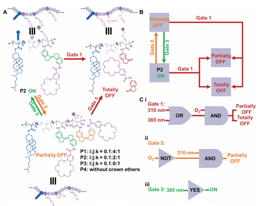 针对以上问题,做爱视频 刘俊秋教授团队联合西北工业大学闫毅教授团队首次提出光控逻辑门离子通道的概念,并将该人工钾通道用于抗癌治疗。作者将分子马达概念与人工离子通道概念结合起来,构建了一种基于分子马达的单链无规共聚合物(RHPs)的光控逻辑门控K+通道,该通道具有类似多核处理器的特性,可逐步控制离子传输。以氧气、脱氧和不同波长的光作为输入信号进行设计,建立了由 "YES"、"AND"、"OR "和 "NOT "门元件组成的复杂逻辑电路。执行这些逻辑电路用K+的传输状态作为输出信号,作者在脂质体和癌细胞中均实现了多种传输状态的转换,包括 "开启"、"部分关闭 "和 "完全关闭",从而进一步实现了分步抗癌治疗。在 "ON "状态下,急剧的K+外流(7 分钟内减少 50%)可显著诱导癌细胞凋亡。作者期待这种集成的逻辑门控策略能在理解NCPs的微妙机制和治疗癌症或其他疾病方面得到推广。