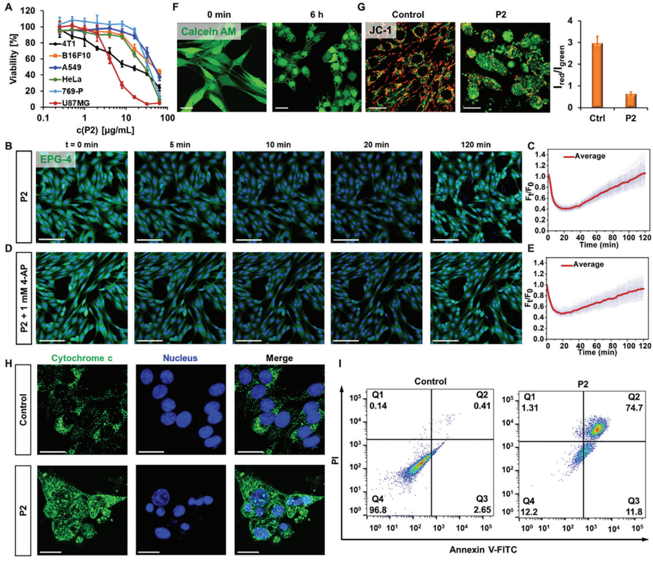 该分子马达在不同的逻辑门指令下,可以发生E-Z构型的可逆转变或者不可逆的光氧化断裂。紫外表征图中可以看出,对(E)-M1执行“Gate 1”指令时,结构上会发生光氧化断裂(340 nm和360 nm处的特征吸收峰消失),对(E)-M1执行“Gate 2”指令时,结构上会部分变成(Z)-M1;再执行“Gate 3”,又会变成(E)-M1。通过对P2执行不同的逻辑门指令,可以发生结构上的转变。对于其功能上的转变,用钾离子的传输速率作为输出信号,从HPTS实验发现,执行“Gate 1”指令时,K+的传输活性可以从“开”切换到“完全关闭”的状态。执行“Gate 2”指令时,K+的传输活性可以从“开”变成“部分关闭”的状态,再次执行“Gate 3”指令时,可以从“部分关闭”切换到“开”的状态。测定P2 的抗癌效果发现P2对U87-MG等6种细胞均具有优良的抗癌活性,并且该抗癌效果与K+的外流密切相关。通过细胞色素C的释放,线粒体膜电位的丢失以及流式实验证明癌细胞是以凋亡的机制死亡的。在细胞层面验证该逻辑门指令的可行性发现通过对P2执行不同的逻辑门指令,K+外流的速率不同,并且可以控制癌细胞的凋亡。