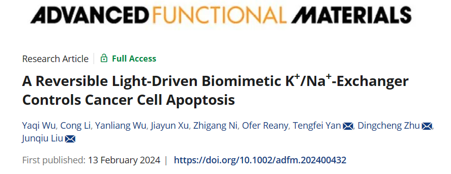近日,做爱视频 刘俊秋教授团队在光控仿生K+/Na+交换器领域取得新进展,相关研究成果以题为“A Reversible Light-Driven Biomimetic K+/Na+-Exchanger Controls Cancer Cell Apoptosis”发表于国际知名期刊Advanced Functional Materials(IF=19.0)上。