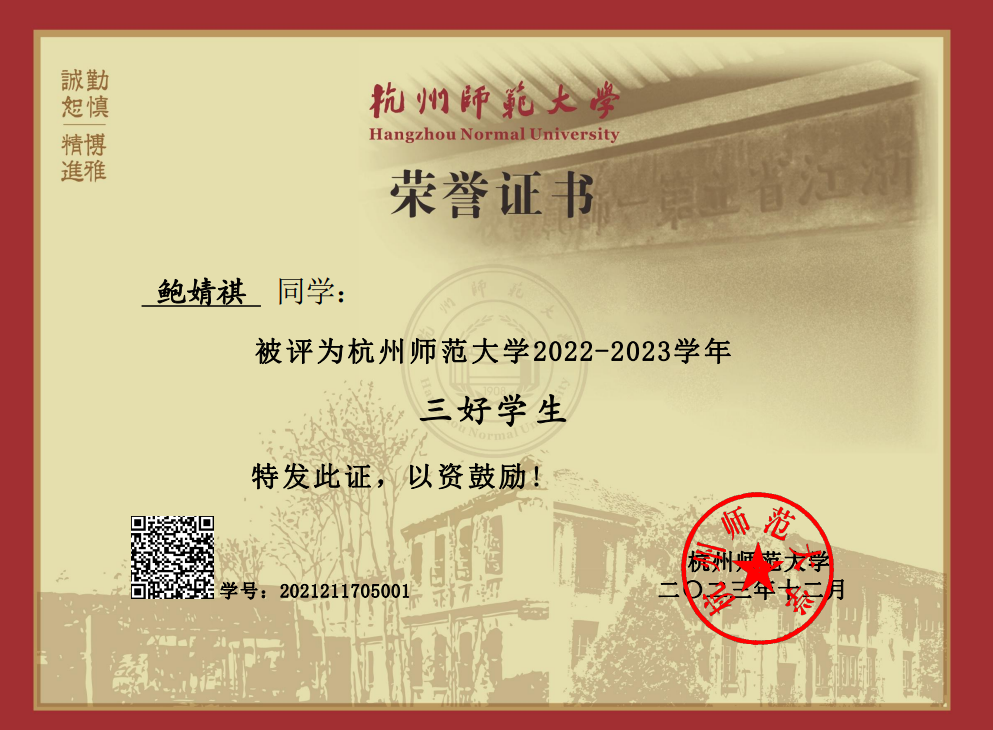 作为化学(师范)211团支部的班委,鲍婧祺同学和高楚轩同学与支部成员共同探索奋进,带领团支部获评杭州市教育系统先进团支部、校“五四红旗团支部”、校十佳文明班级等荣誉称号,支部成员也将继续携手共进,共创未来!