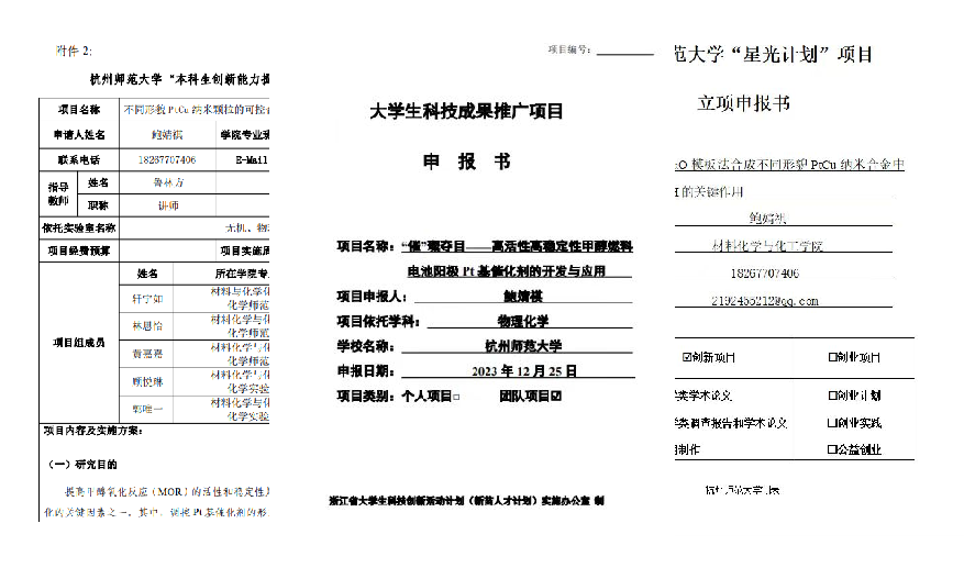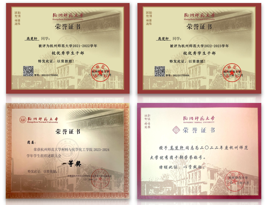 在大一专业课上,鲍婧祺同学对燃料电池催化剂产生了浓厚的兴趣,随后主动联系学院研究催化剂方向的鲁老师,成为一名科研助理,累计实验时长超2000小时,制作催化剂样本819份,经过不懈努力,成功发表三篇SCI论文,负责省级、校级课题3项,申请2项发明专利,同时,她积极参与各类竞赛,获得浙江省第九届互联网+银奖、浙江省化学竞赛二等奖、希望杯二等奖、精进杯一等奖等省级校级奖项。