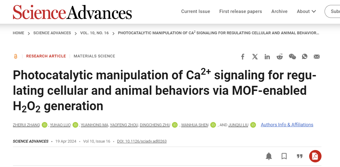 近日,杭师大做爱视频 刘俊秋教授团队/生环学院沈万华教授团队携手合作,在生物Ca2+信号激活的交叉研究领域取得突破性进展,相关研究成果以题为“Photocatalytic manipulation of Ca2+ signaling for regulating cellular and animal behaviors via MOF-enabled H2O2 generation”发表于Science子刊Science Advances(IF = 13.6)。